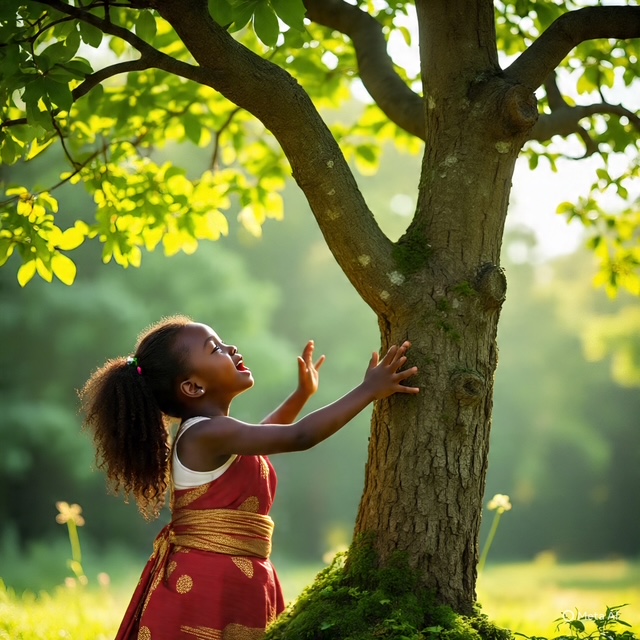 Alors l’enfant mangeait ces fruits, mangeait ces fruits. Cet arbre ne mourut pas, jusqu’au point où l’enfant puisse prendre soin d’elle-même. Elle a donc survécu des fruits laissés par sa mère.